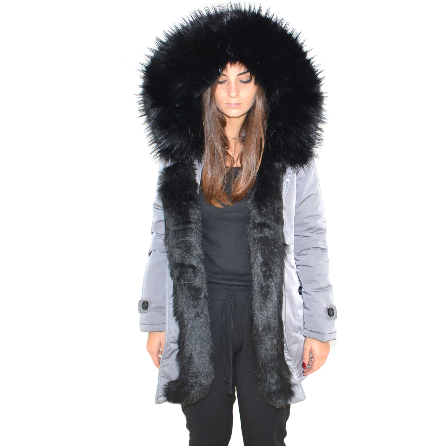 Parka donna invernale con pelliccia nero eco giacca giubbotto piumino lungo grigio pelo extra volume imbottito caldo mod donna parka K ZELL | …