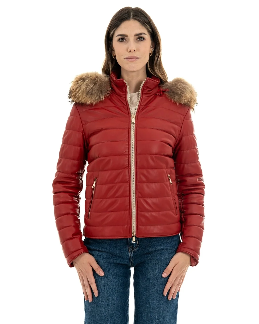 GRACE Piumino con cappuccio da donna in vera pelle rosso Doppia Pelle